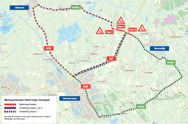 Tijdens deze fase worden de bomen vanaf de A7 tot de rotonde Tijnje verwijder. De werkzaamheden worden op werkdagen van woensdag 17 december t/m vrijdag 19 december 2025 en op maandag 5 januari en dinsdag 6 januari 2026 tussen 09:00 uur tot 15:00 uur uitgevoerd. De weg is dan volledig afgesloten en voor het verkeer geldt een omleiding. Buiten deze tijden kan het verkeer er langs.